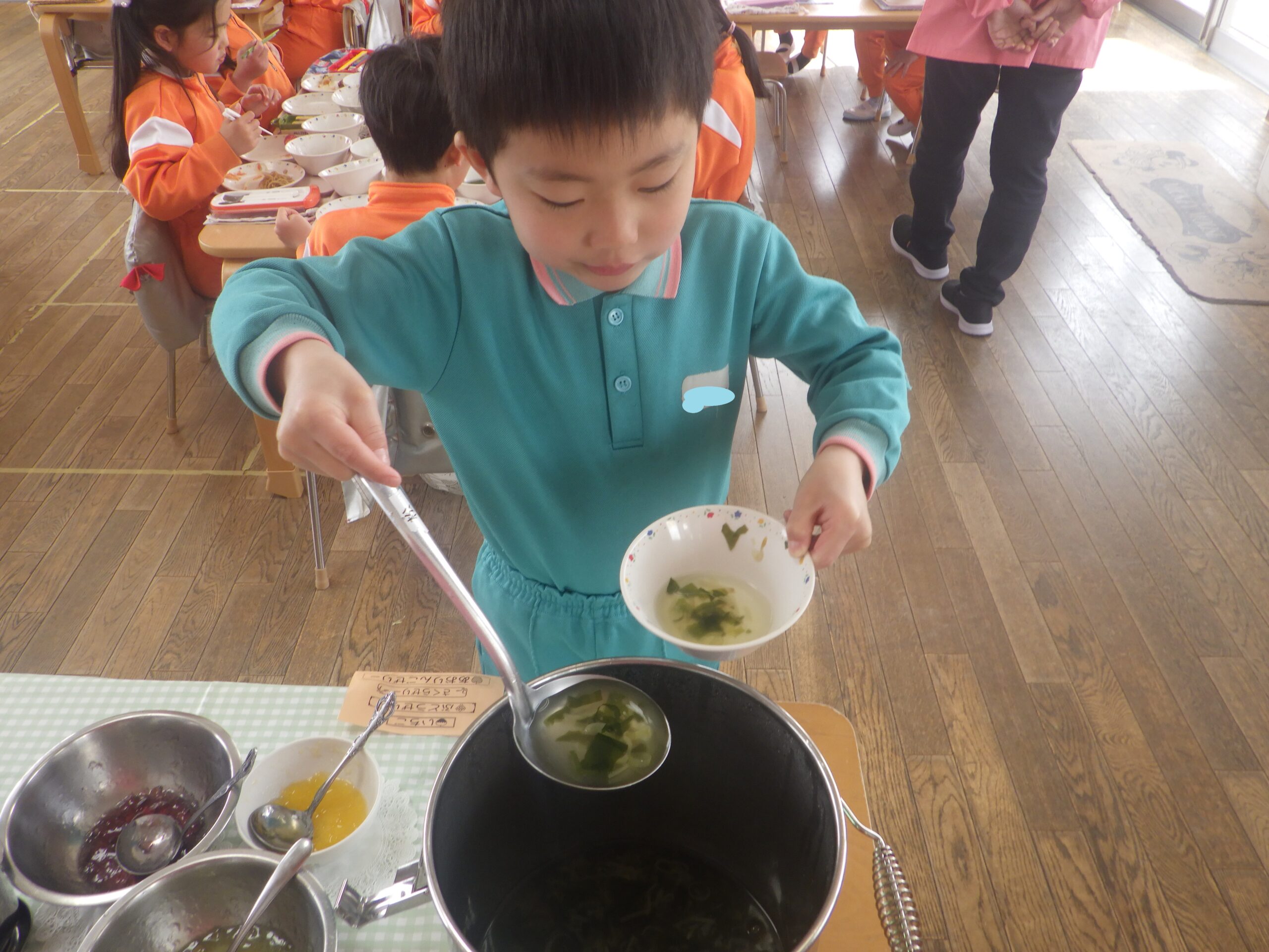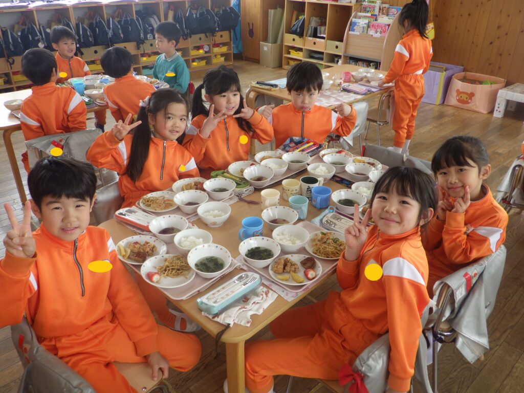 みんなと食べる給食の時間もあと少し。最後までおいしく食べようね